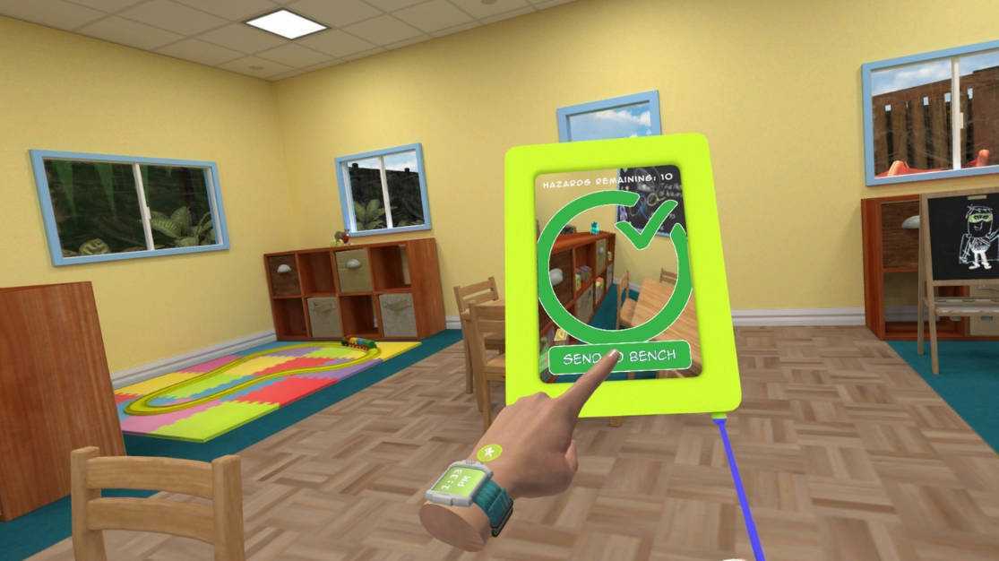 儿童保育是一种独立的体验,您可以在其中识别危险。 在托儿中心周围自由移动,同时使用危险摄像头识别有潜在危险的玩具和物品,然后将它们全部收集起来并分类,以确定它们是否损坏、脏污或是否可以安全返回游乐区。